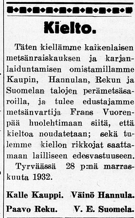 Vanhusten kertomaa on myös, että ennen vanhaan suo niin läheisesti ympäröi asumuksia, että tuskin saattoi kunnolla kulkea naapuriasunnosta toiseen. Vesilahden puolella sijaitsevasta Formistosta on tullut polku Perälään ja sitä pitkin on sieltäkin tullut koululaisia Rautaniemeen, vielä 1940-luvulla!
