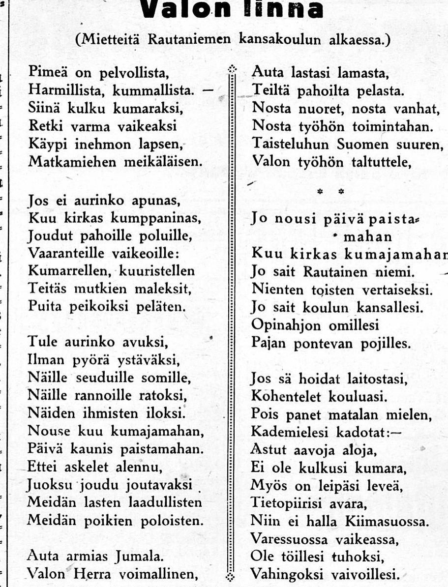 - "myyrään koko roska pois", sanoi eräs paikallinen kunnanvaltuutettu Rautaniemen talkoilla rakennetusta koulusta, ja se loukkasi kyläläisiä